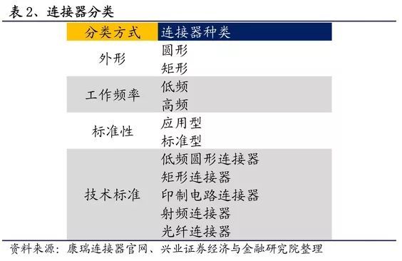 别的,考虑到连接器的技术生长和实际情况,从其通用性和相关的技术标准,连接器可以分为低频圆形连接器、矩形连接器、印制电路连接器、射频连接器、光纤连接器